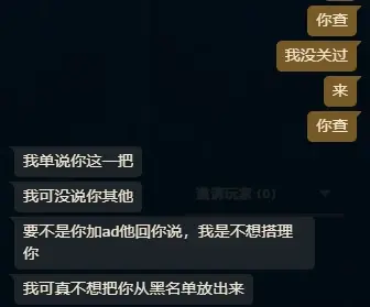 这把就算我倒霉其实就结束了。中上说没帮,下还炸,我就说下路俩菜,然后这猫就开喷。说实话喷的理由也是奇葩,说是我没C也没段位没资格说他俩菜,然后说他们下路俩弱势组合拿不到线权很正常。然后就逮我一直搁着喷。然后我就说下路俩组合能抢,然后就一直喷,喷到游戏结束,问我怎么抢,我说赛后解释。然后赛后加了这猫好友,也是两次不通过直接拉黑,最离谱的是ad加我,跟我说根本不想理我,然后猫又取消黑名单主动加我隔着喷。真的是笑死。