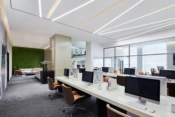 4,照明设计:选择合适的照明方案,结合自然光和人工照明。确保室内光线充足、柔和,避免眩光和阴暗,为员工提供舒适的工作环境。
