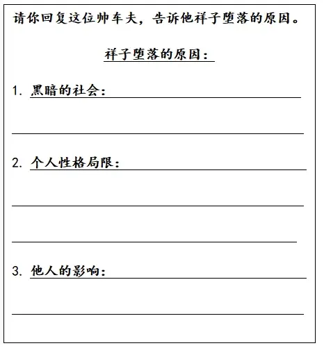 祥子经历 “三起三落” 后彻底堕落,沦为 “城市垃圾” ,原因发人深省。学生回忆全书内容,从社会,自身,他人三个角度回答祥子堕落的原因。要求分点答题,内容全面。