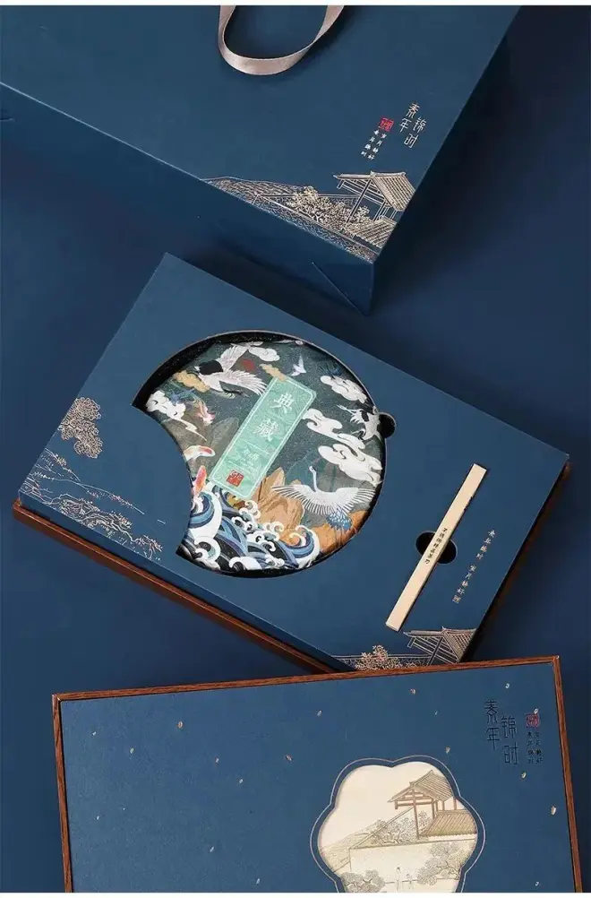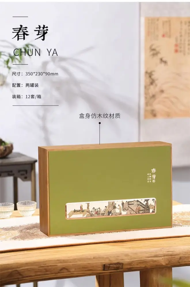 古画式样的点缀,深色调与仿木特种纸的结合,让礼盒多了些古典素雅。