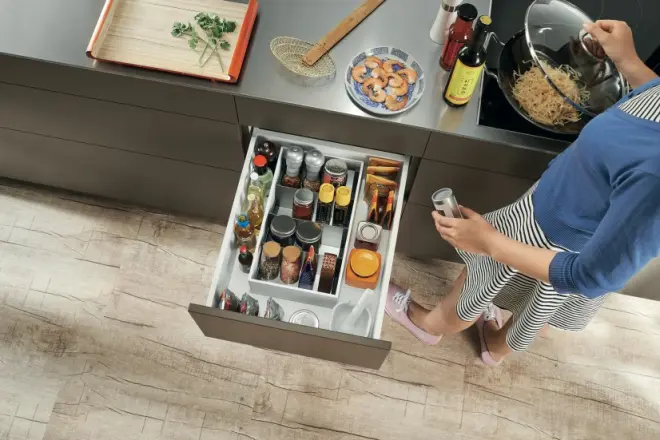 盐、胡椒、香料等都是厨房的必备调味品。菜肴在锅中嗞嗞作响时,必须手疾眼快,迅速调味。在炉灶旁用一款高抽来收纳需防潮防高温的调味品,不啻为理想的解决方案。从上向下俯视高抽,轻轻松松就能找到需要的调料,即刻就能拿来使用。除此之外,厨房也变得更加井然有序,各式瓶瓶罐罐都可免遭灰尘与油烟的侵扰。