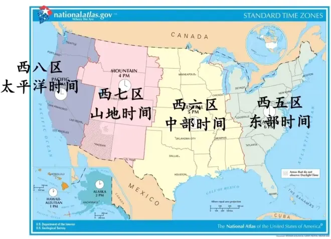 - 美国本土由东到西包括西5区至西8区4个时区;这4个时区分别采用本时区的区标准时间,自东向西依次为东部时间、中部时间、山地时间和太平洋时间(了解即可)