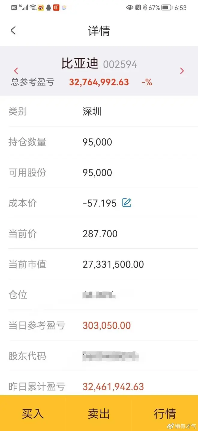 如果曾经有人看不起比亚迪,认为比亚迪只会做低端车的人,现在看到比亚迪的崛起,是不是有种被打脸的感觉,或许作为消费者,曾经不买比亚迪,也可以买别的汽车,作用都一样,代步就可以,这也没问题,但对于投资者,你被打脸的感觉就不太好了吧,下面这张图,一位大神57元入手的比亚迪,重仓持股到现在,现在还不止是图片里面的收益,以今天的股价来算,持仓3226.2万,足以在一线城市买一套不错的三居室了。