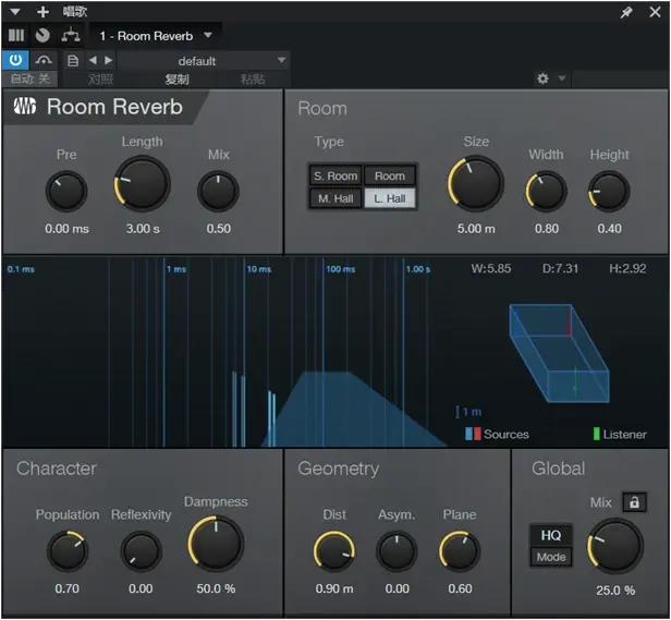 给唱歌轨添加混响,点击插入旁的加号,在PreSonus上找到Room Reverb