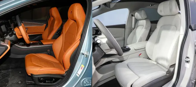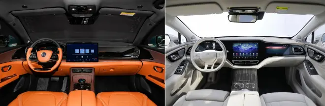 两者座舱都采用了“正T型仪表台”+“环抱式”设计,仪表台和车门衬板衔接都很自然,融合度较高,两者设计一眼区别在于座舱屏幕和挡位面板。