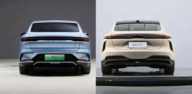 汉EV车尾造型风格和车头保持一致,这种所谓中庸之道确实能赢得更多国人喜欢;飞凡F7车尾灯组+标识辨识度很高,夸张的运动包围就和汉EV一眼区别开来。