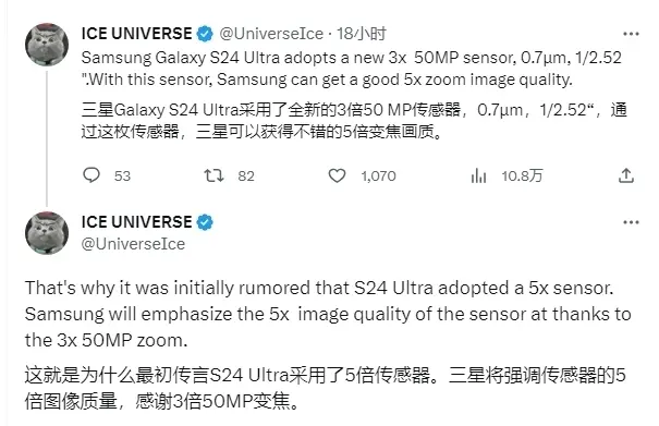 ——10 倍长焦,主摄和超广角,硬件传感器不变。