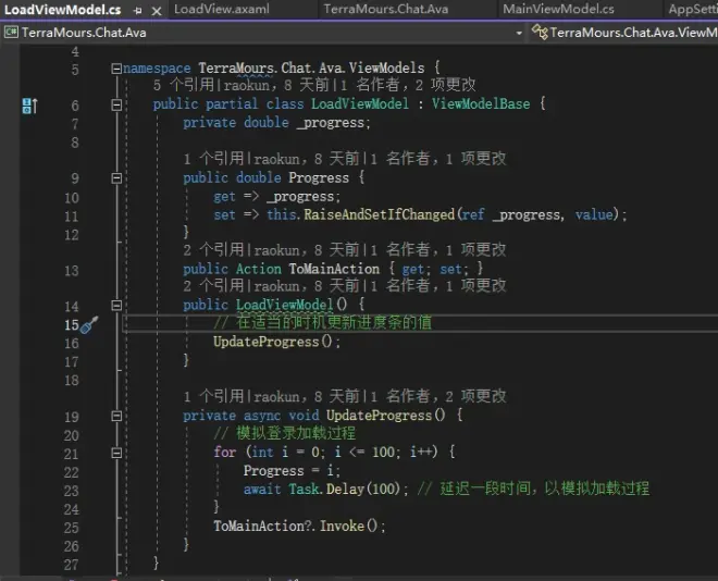 界面的跳转,通过Action委托来完成,首先在LoadViewModel中定义 ToMainAction,在上面的UpdateProgress方法完成时执行Invoke,而ToMainAction的实现方法,写在OnFrameworkInitializationCompleted方法中。