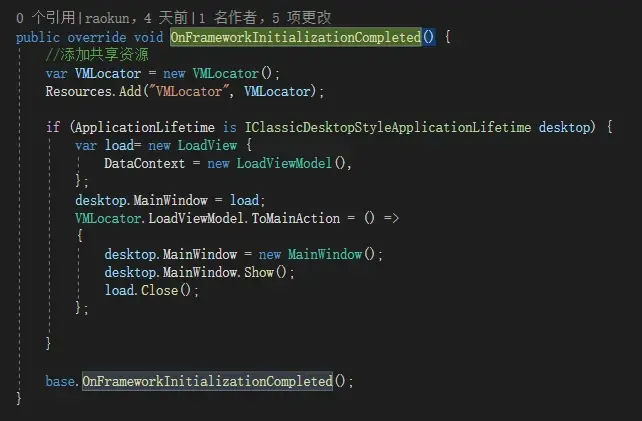 设置首个加载界面,需要在App.axaml.cs中的OnFrameworkInitializationCompleted方法中设置 desktop.MainWindow