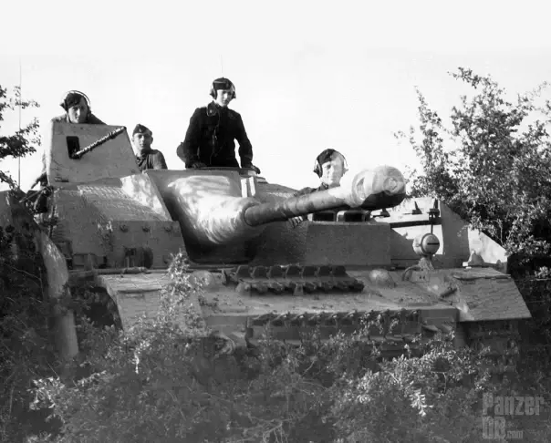 8月开始配备圆筒形排气管,与四号坦克同步在车尾左后部加装三个备用履带固定具,用于装设10节备用履带,车辆涂装改涂“伏击迷彩”