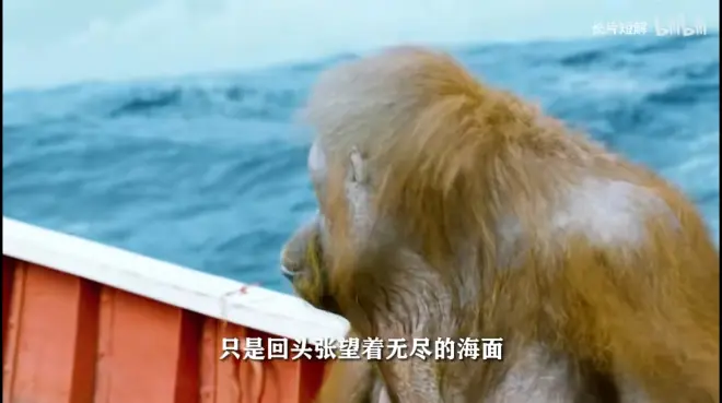 这里是以派发问,母猩猩沉默望向海面而回答的。