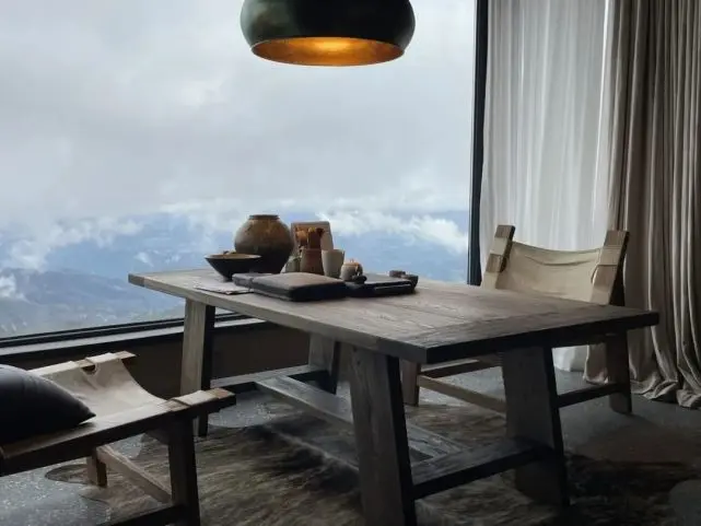 朴语野奢酒店由中国设计师朱桁萱硬核科技打造,35天光速完成,风格古色古香,冬天可以泡温水,夏天可以泡凉水泡池,大大的落地窗,透过窗户就可一览无余的美景,每个房间都是独立的小屋,房间内从墙壁上的装饰,皮质的沙发设计、灯饰、到桌子、餐具、茶具等都是满满细节,很有特色,据说他家的家具都是全球搜集来,基本都是全手工打造!