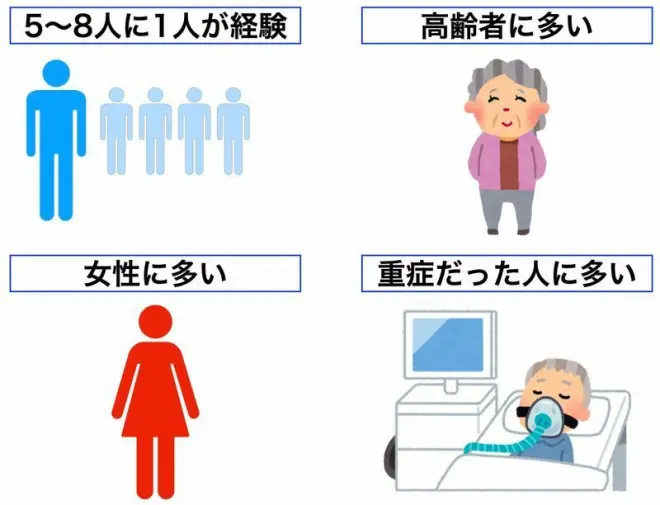 また、男性よりも女性に、若い人よりも高齢者に、そして新型コロナに感染したときに重症だった人に多いことが分かっています。
