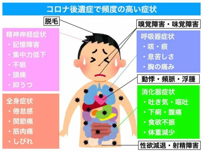 按照出现频率,后遗症依次为:倦怠感,喘不上气,嗅觉异常,脱毛,注意力下降等等