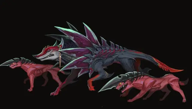 在纳亚菲利的概念探索阶段,美术师参考了游戏《大神》里的神犬,还有《黑暗之魂》里的希夫。他们希望角色能够保留更多的狗生物特征,因此还参考了非洲野狗,来制作了恕瑞玛的沙丘猎犬。虽然角色的内核是黑暗,但纳亚菲利看起来并不像是地狱犬,狗群首领身上有一圈匕首状的设计,耳朵的吊坠是纳亚菲利的最后信物,跟班狗则是头部位置有匕首设计。