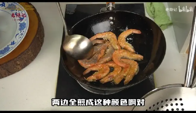 两面煎上色,翻面继续煎时用勺子按虾头,让虾脑释放出来。