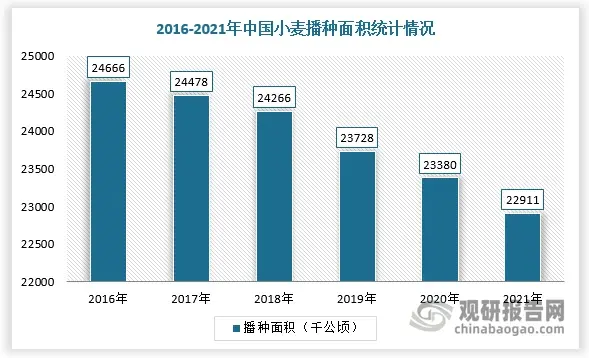 面粉主要是指由小麦加工而成的产品。小麦在我国是仅次于水稻、玉米的主要粮食作物,历年种植面积约占粮食作物总面积的20%,截止2021年国内小麦播种面积为22911千公顷,减少5.5%。