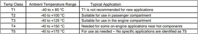 由于车辆的不同区域表现出不同的温度,USCAR 为部件指定了五个温度等级。为了确保安全,组件经过热循环、高温湿度循环和高温暴露测试。
