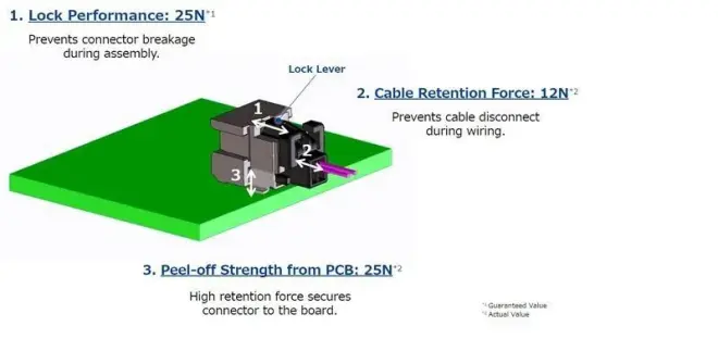 这张小型线对板连接器的示意图说明了线对板连接器容易断裂的三个位置。