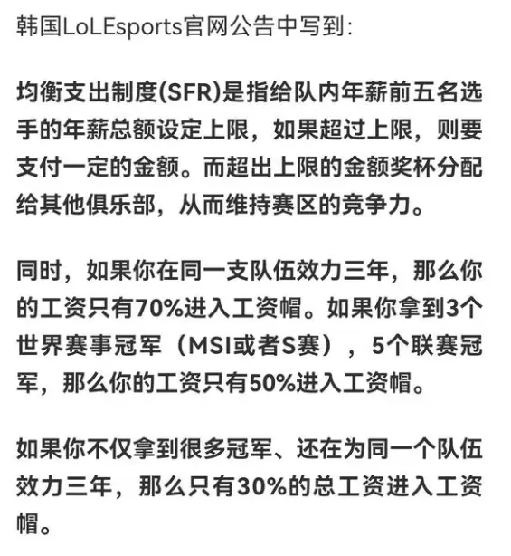 大家好啊,近日LCK官方公布了最新公告,大概意思就是2023年冬季转会期LCK联赛也要启用工资帽对选手限薪,大概就是给每个队伍年薪前五名的选手总额设定一个上限,如果队伍超过这个上限签约选手,则是需要上交一定的支付金额(类似于我们LPL的奢侈税吧),当然如果你在同一个队伍效力了三年,那你的工资只有70%进入工资帽,如果你拿到了3个世界赛冠军(S赛和MSI季中赛),5个联赛冠军,那么你的工资只有50%进入资帽,最后一个就是符合上面两个条件的话,那么只需要30%的工资进入工资帽了!
