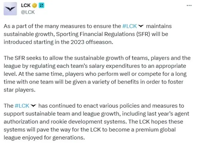 LCK官方公告:将启用工资帽对选手限薪,网友戏称:Faker条款?
