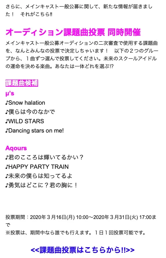 同日,LoveLive!新系列企划(即后来的LoveLive! Superstar!!)声优甄选二次审查时使用的课题曲投票、学校名称投稿募集开始。