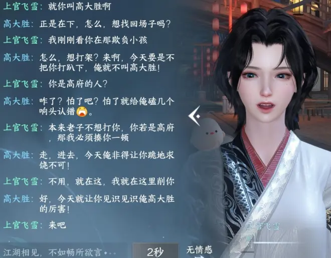 我们先来看一个相对比较正常的对话,这个高大胜就是游戏内的一个NPC,他的人设就是一个冲动的高府高衙内的手下。