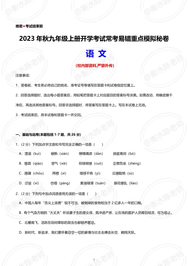 九年级上学期语文,开学考试必出重点考题,临近开学,很多学校会组织大家,开学来一次考试,检验一下,暑假期间学习情况,根据每个班级考试情况,制定合适的学习方案,以及学习进度,九年级的同学,这一年非常的关键,关系到升学考试,是同学们最重要的一次人生转折,考题根据不同的城市和学校编写的重点考卷,想要获取,并考出好成绩的,记得和我沟通哦。
