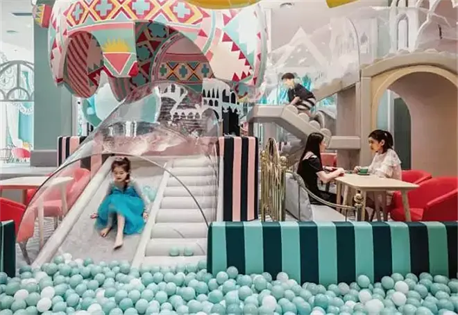 国内把孟菲斯风格运用的比较好的一位女设计师李想,“杭州奈尔宝儿童游乐空间”是她多数代表设计案例中的其中一个,揉合几何造型、色块和三角图案元素错落有致,粉紫调中大量的黑色勾边点缀,又带来一份前卫,打破了平面形态的限制通透十足,这也是孟菲斯典型的扁平化设计。