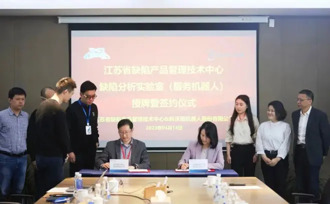 4月14日,“江苏省缺陷产品管理技术中心缺陷分析实验室(服务机器人)”签约暨授牌仪式在苏州市科沃斯机器人股份有限公司隆重举行。省质量和标准化研究院院长、省缺陷产品管理技术中心主任管旭琳,省市场监督管理局质量发展处、苏州市市场监督管理局、科沃斯机器人股份有限公司相关负责人及代表出席仪式。省质量和标准化研究院副院长王延维主持仪式。
