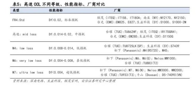 高速 CCL 是指具有高信号传输速度、高特性阻抗精度、低传送信号分散性、低损耗(Df)的覆铜板。高速板分了很多等级,一般用标杆公司松下(Panasonic)的 M 系列对比,如 M4、M6、M7 等,数字越大越先进,适应的传输速率越高。M4 级别是 low loss 级别的材料,大致对应传输速率为 16Gbps,M6 级别是 very low loss 级别的材料,M7 级别是 super ultra low loss,大致对应传输率为 32Gbps。