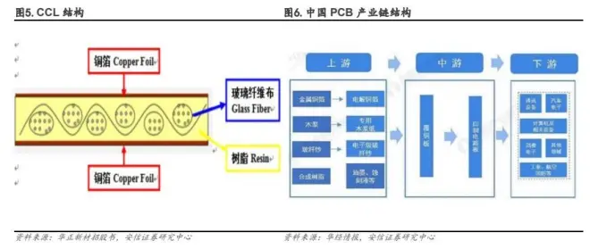 CCL,全称为 Copper Clad Laminate,中文名叫覆铜板,是一种将电子玻纤布或其他增强材料用树脂浸渍,一面或两面用铜箔覆盖,再经过热压而制作成的一种板状材料,具有介电性能及机械性能好等特点,其上游主要包括铜箔、树脂、玻纤布等原材料行业,下游主要包括通讯设备、消费电子、汽车电子等领域。