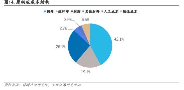 覆铜板具有三大原材料:铜箔、树脂、玻纤布,总成本占比接近 90%。不同覆铜板产品原材占比会有些许不同。据前瞻产业研究院的数据,铜箔、树脂、玻纤布分别占覆铜板成本的比例约为 42.1%,26.1%,19.1%。