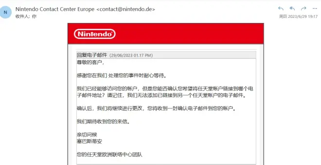 与此同时我还问了日本任天堂能不能提供账号当前绑定的完整邮箱,结果他们说不行,因为没办法确保我是不是本人,我。。。。。。咱们还是指望欧洲团队吧