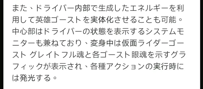 假面骑士ghost的全身各部分是由被称为“quantum solid”的微小金属体形成的,通过给予能量,可以使其状态和性质自由变化。