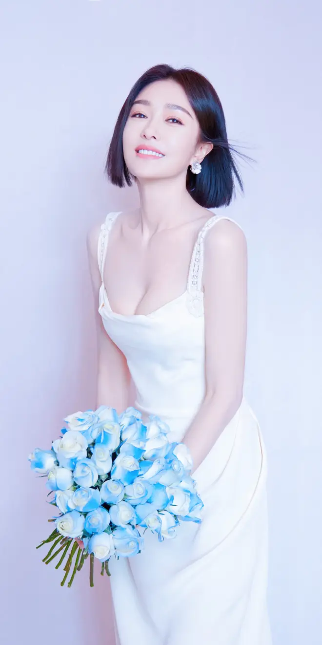 秦岚春日浪漫写真,短发朱唇白裙罗绮,明艳而优雅动人