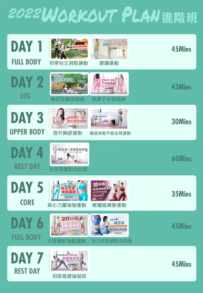 这是林芊妤2022年制作的运动计划,分别为初阶班(BV1Sa411U766)、进阶班(BV1cr4y1j75Y)、自虐班(BV1HT411j754)、女性周期班(BV1oY4y1A7nX)、孕妇班(BV1pT411j76F),大家可以自由选择不同的程度,也可以因应自己的能力去变换。更多关于运动计划的讲解可以看这个视频(BV15t4y1V7VH)。