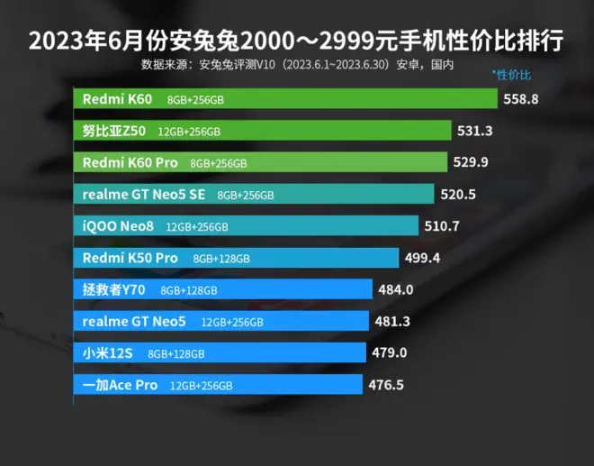 因为这个榜单中展示了5款性价比极高的机型,并且这五款手机产品还霸占了不同价位榜单中的佼佼者。