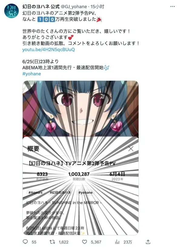同日,幻日的夜羽第二弹预告PV的播放量突破100万。