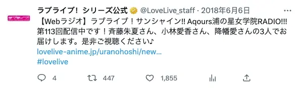 五年前的今天,2018年6月6日,LoveLive! Sunshine!!广播节目「LoveLive! Sunshine!! Aqours浦之星女学院RADIO!!!」第113回开始放送。主持人:YYY(降幡爱、齐藤朱夏、小林爱香)。