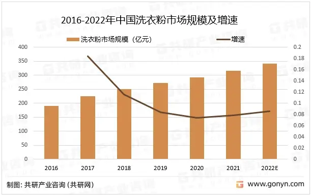 虽然洗涤合成剂产品逐年增多,洗衣粉在洗护产品需求量仍保持着重要地位,预计2022年中国洗衣粉市场规模同比增长8.8%。