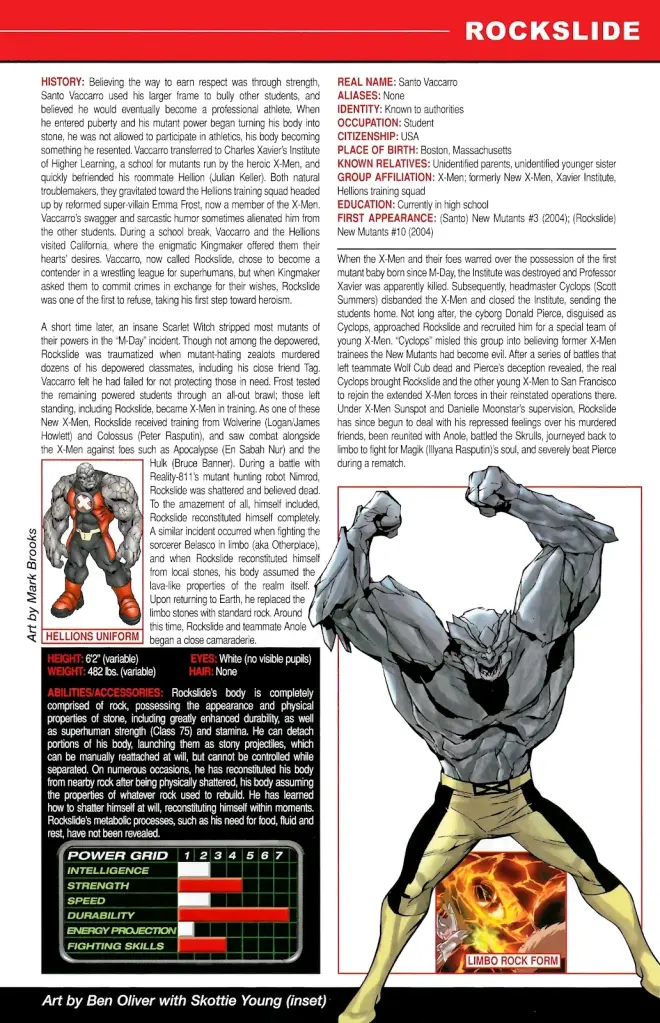桑托·瓦卡罗(Santo Vaccarro)的家族起源于意大利,从小他就比其他孩子显得更高更强壮,而且他总是看起来是那么的坚强。因为,他的父母告诉过他,要想得到别人尊重的唯一办法就是向别人证明他是最坚强的。之后,在父母的鼓励下使他成为一名高水平的运动员,当他第一次显现出变种人能力时,他变得比其他人更大更强壮,他的身体被一块块岩石覆盖着,并且还可以随意分离。虽然,他现在是学校最强壮的孩子,但是,同时也被同学们视为一只怪物。于是,桑托来到了泽维尔研究所,在那里,他被分配到由学校艾玛·弗罗斯特(EmmaFrost)指导的捣蛋鬼军团(Hellions)小组,并与该小组的领导者朱利安·凯勒(JulianKeller)成为朋友。在M-Day的影响之后,桑托足少数没有失去力量的学生之一,在面对政府派出的哨兵小队O*N*E (Sentinel Squad O*N*E)时,桑托在艾玛·弗罗斯特(Emma Frost)的安排下全力d对抗,尽可能多的帮助了剩余变种人进行避难,使其成为一名未来的X战警。后来,团队在对付宁录(Nimrod)的战斗中,崩石(Rockslide)的身体被严重摧毁。庆幸的是,即使在他破碎分离的形态下,当团队成员拼命试图唤醒并将他拼凑起来时,他最终重新又组合在了一起,并且变得比以前的形态史大吏坚固。