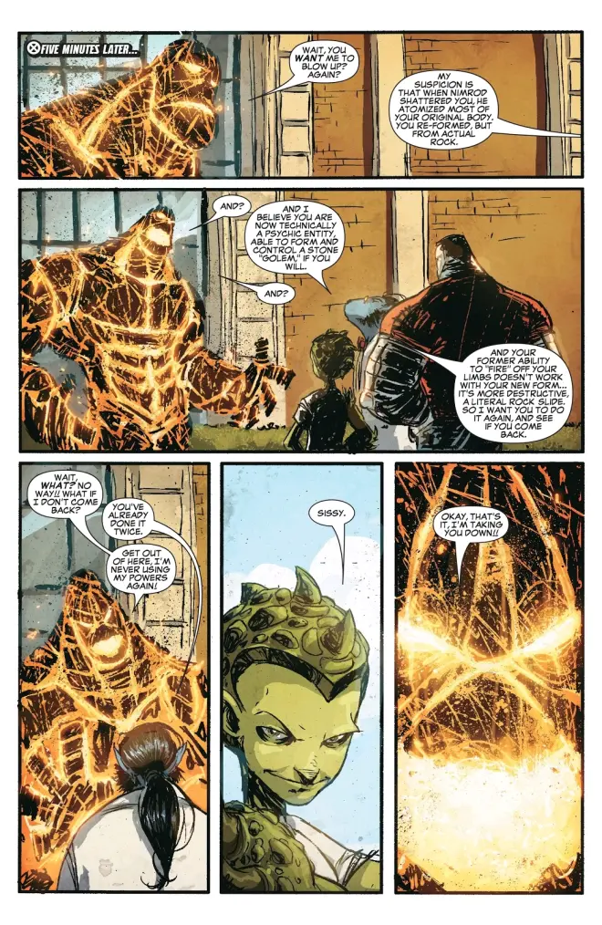 崩石的身体完全由岩石组成,拥有石头的外观和物理特性,包括大大增强的耐久性,以及超人的力量(75级)和耐力。他可以分离自己身体的一部分,把它们像石头一样发射出去,可以随心所欲地手动重新连接,但在分离时无法控制。在很多情况下,他在身体被打碎后,用附近的岩石重建了自己的身体,他的身体具有用来重建的任何岩石的特性。他已经学会了如何随心所欲地粉碎自己,并在瞬间重建自己。崩石的代谢过程,比如他对食物、液体和休息的需求,还没有被揭示。