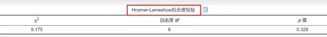 Hosmer-Lemeshow拟合度检验用于判断模型拟合优度。p值大于0.05则说明通过HL检验,反之则说明模型没有通过HL检验,模型拟合优度差。从上表可知:检验对应的 p值大于0.05,说明本次模型通过HL检验,模型拟合优度较好。