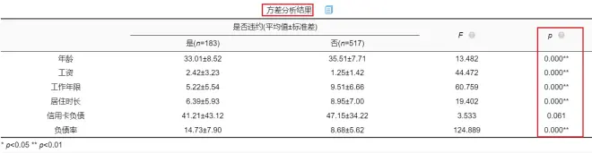 从方差分析结果来看,违约客户与未违约客户的信用卡负债情况并没有呈现出显著性差异(p=0.061>0.05),其余变量都呈现显著性差异。所以,可以将信用卡负债率这一影响因素在后续分析中剔除(如果担心遗漏重要变量,也可以将显著性水平放宽至0.1)。