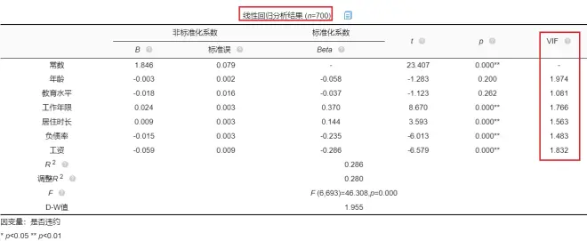 对于因变量为二分类变量的模型的多重共线性判断,也可以使用线性回归方法进行简单查看。使用SPSSAU进行线性回归分析结果如下: