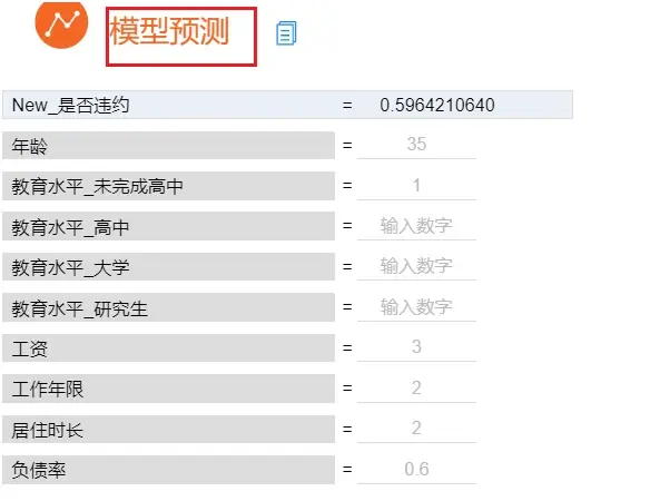 代入数据进行预测:比如想要预测年龄为35岁、教育水平为未完成高中、工资为3万、工作年限为2年、居住时长为2年、负债率为0.6的用户是否违约情况,操作如下图: