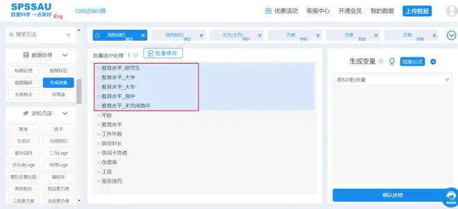 在进行分析时,对于教育水平5个哑变量,需要保留一项作为对照项,不放进分析框中。比如将“教育水平_大专”作为对照项,则不将该哑变量放入分析框中,将剩下的四类教育水平放进分析框中。
