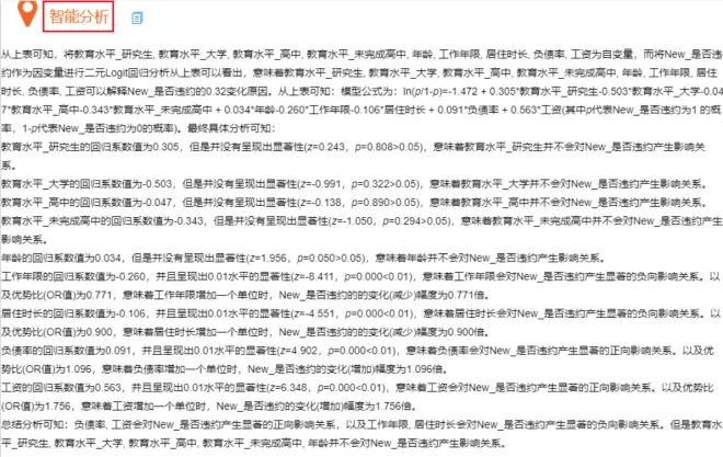 回归分析结果可以参考SPSSAU的智能分析结果进行说明。