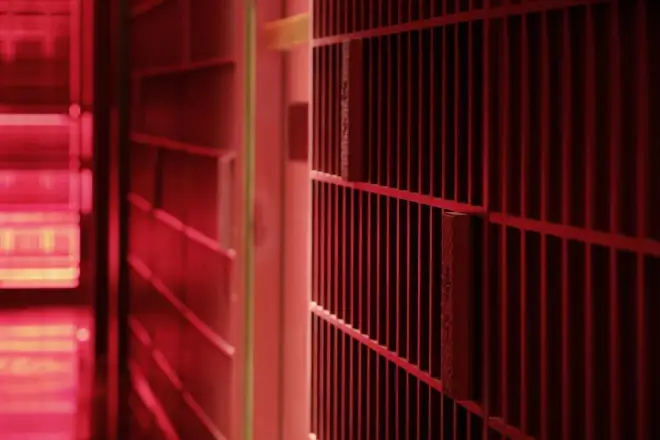 走廊由红色经纬渲染,佛塔点亮尽头,连接时空。
